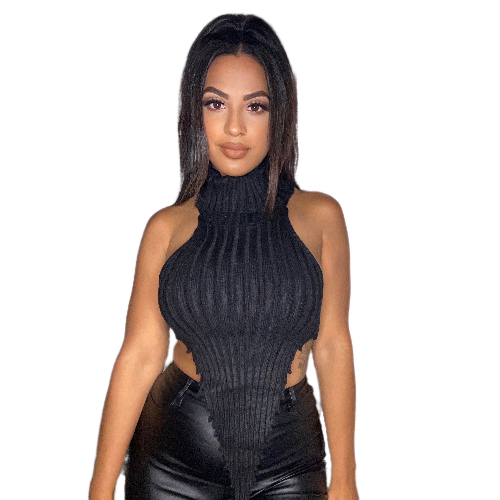 Knit sweater material, Stretch. Model is wearing Size Small.