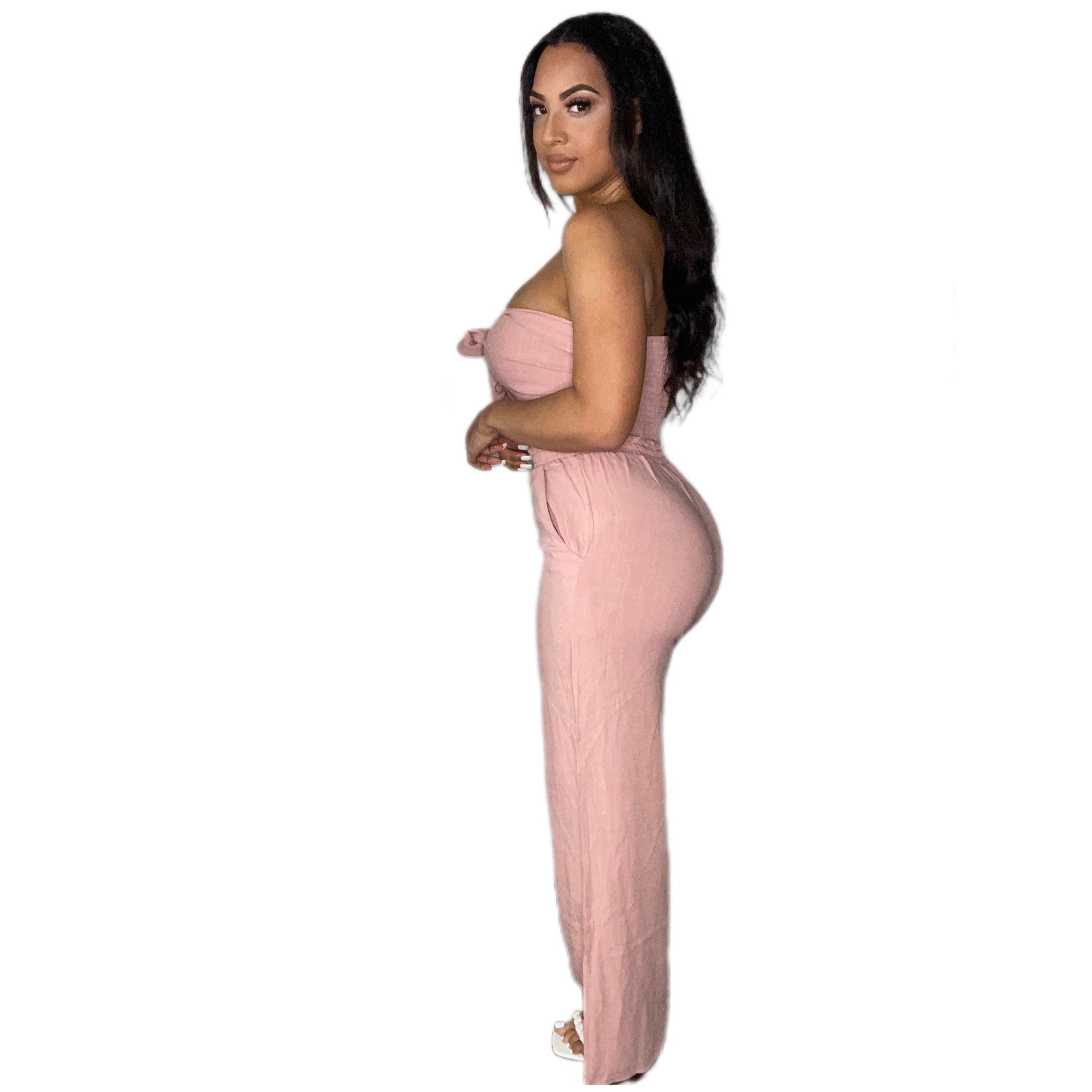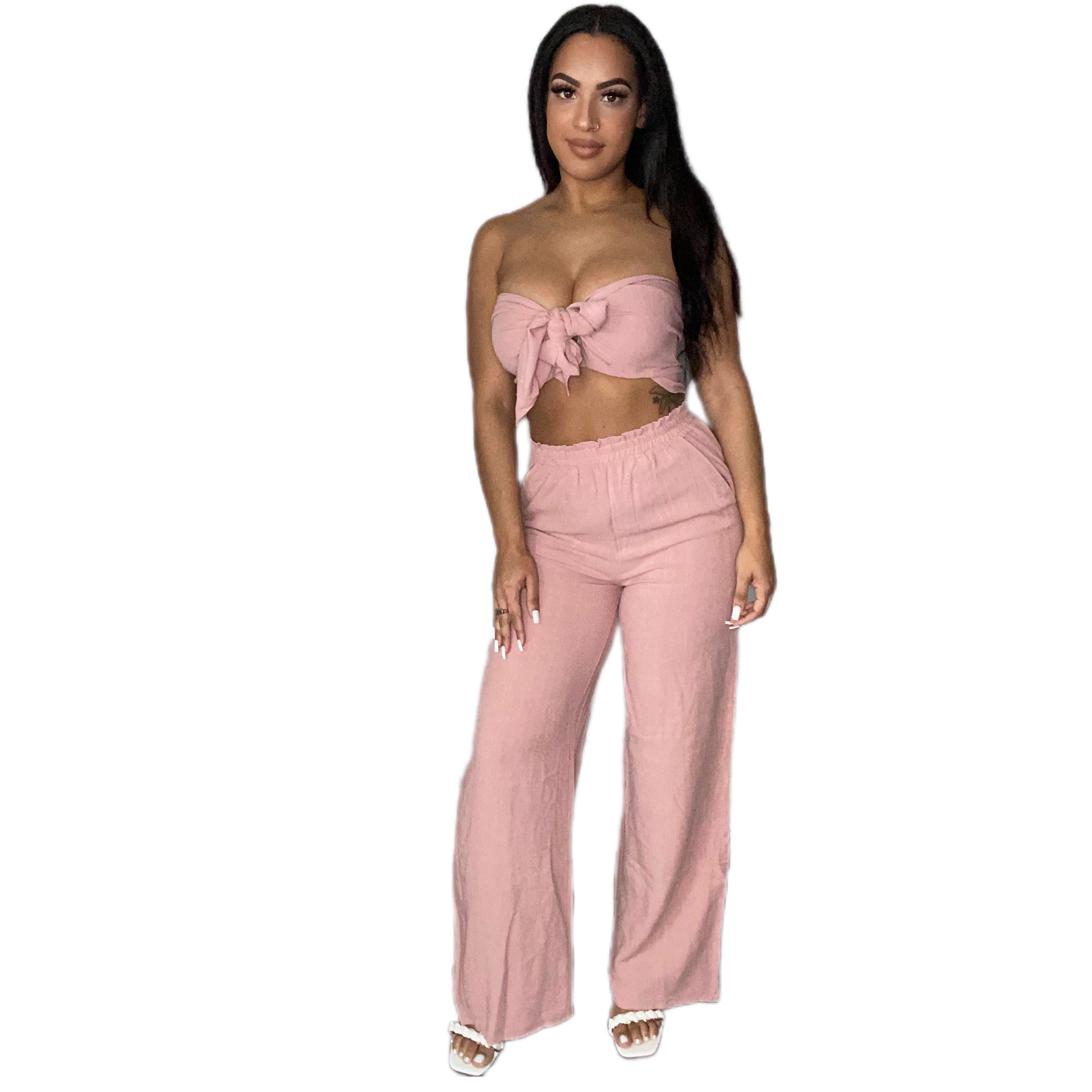 Solid Tie Tube Bandeau Palazzo Pant Two Piece Set. Model is wearing a Small.
