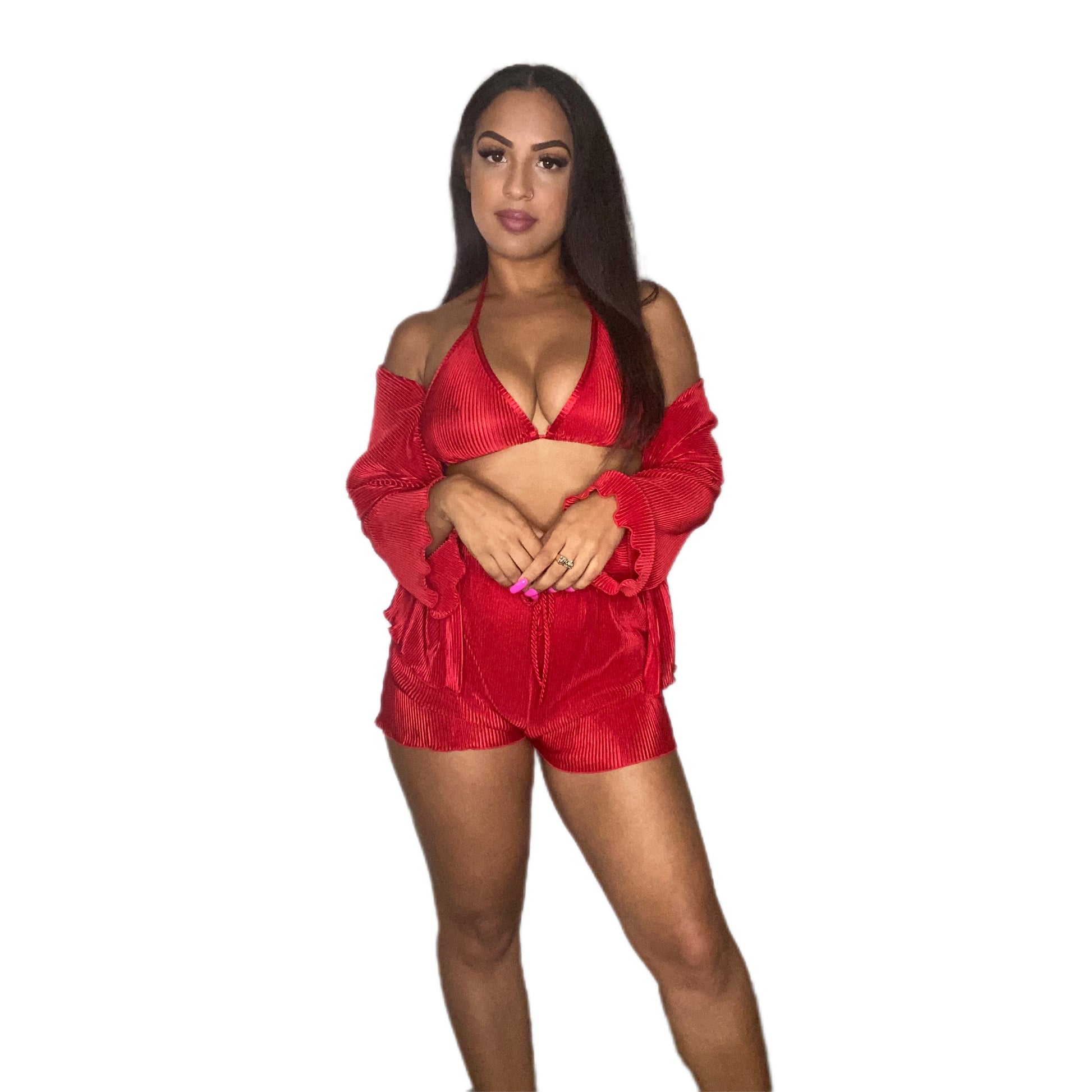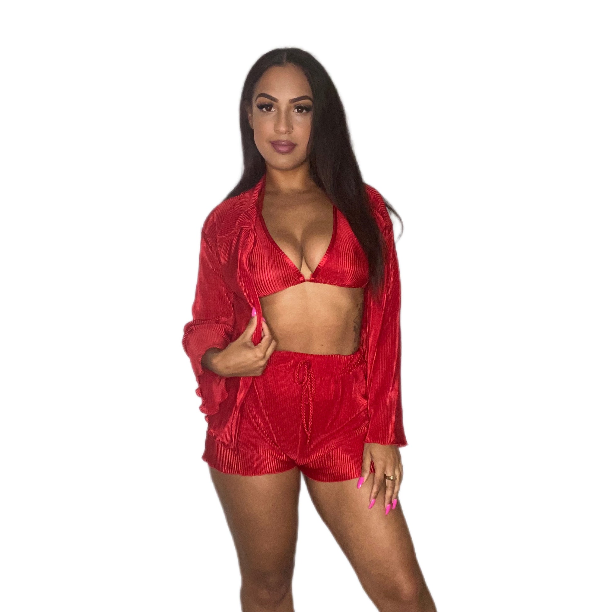 Pleated texture 3 pieces set. Adjustable spaghetti strap halter bra top. Long sleeve collar jacket. High waist drawstring shorts. Model is wearing a size small.