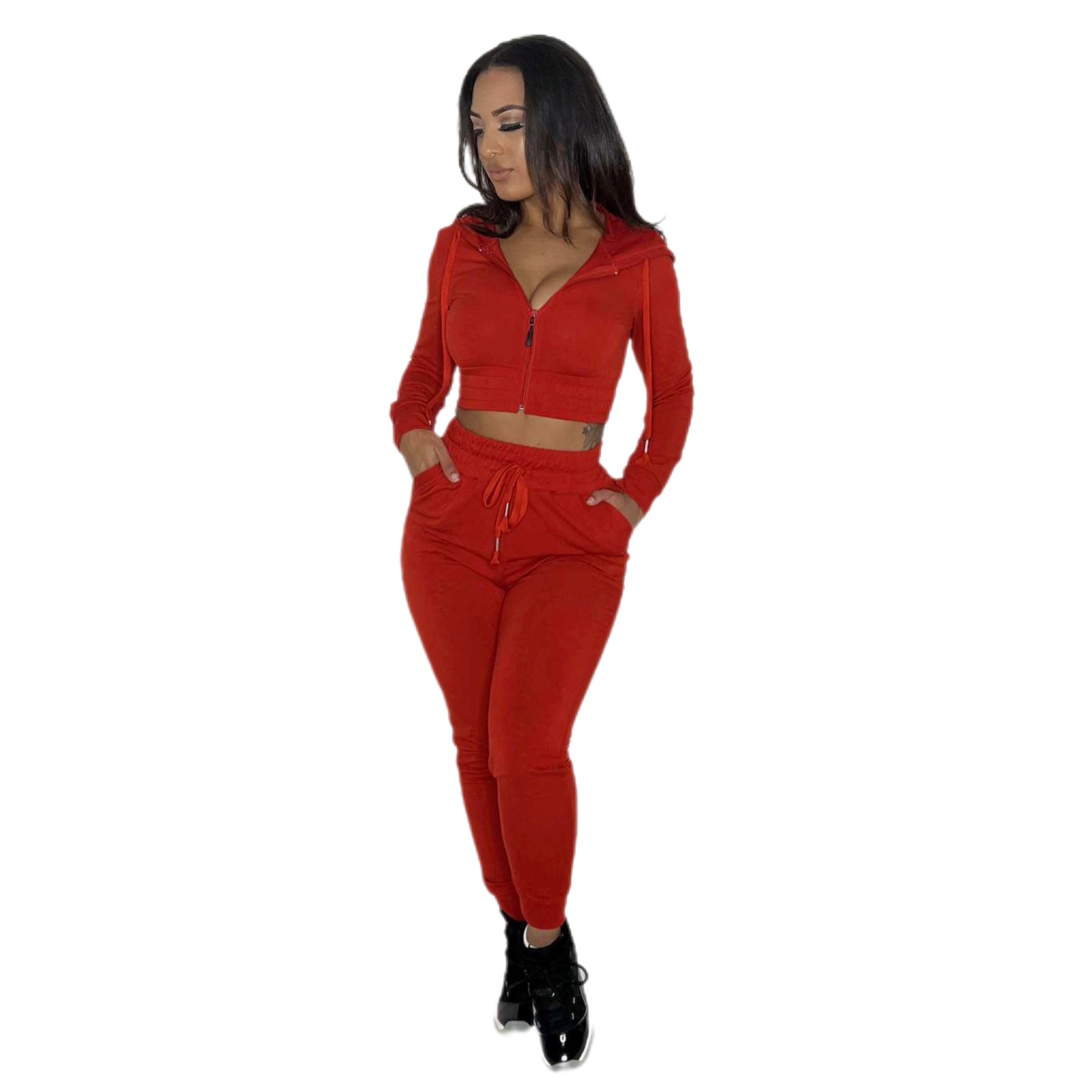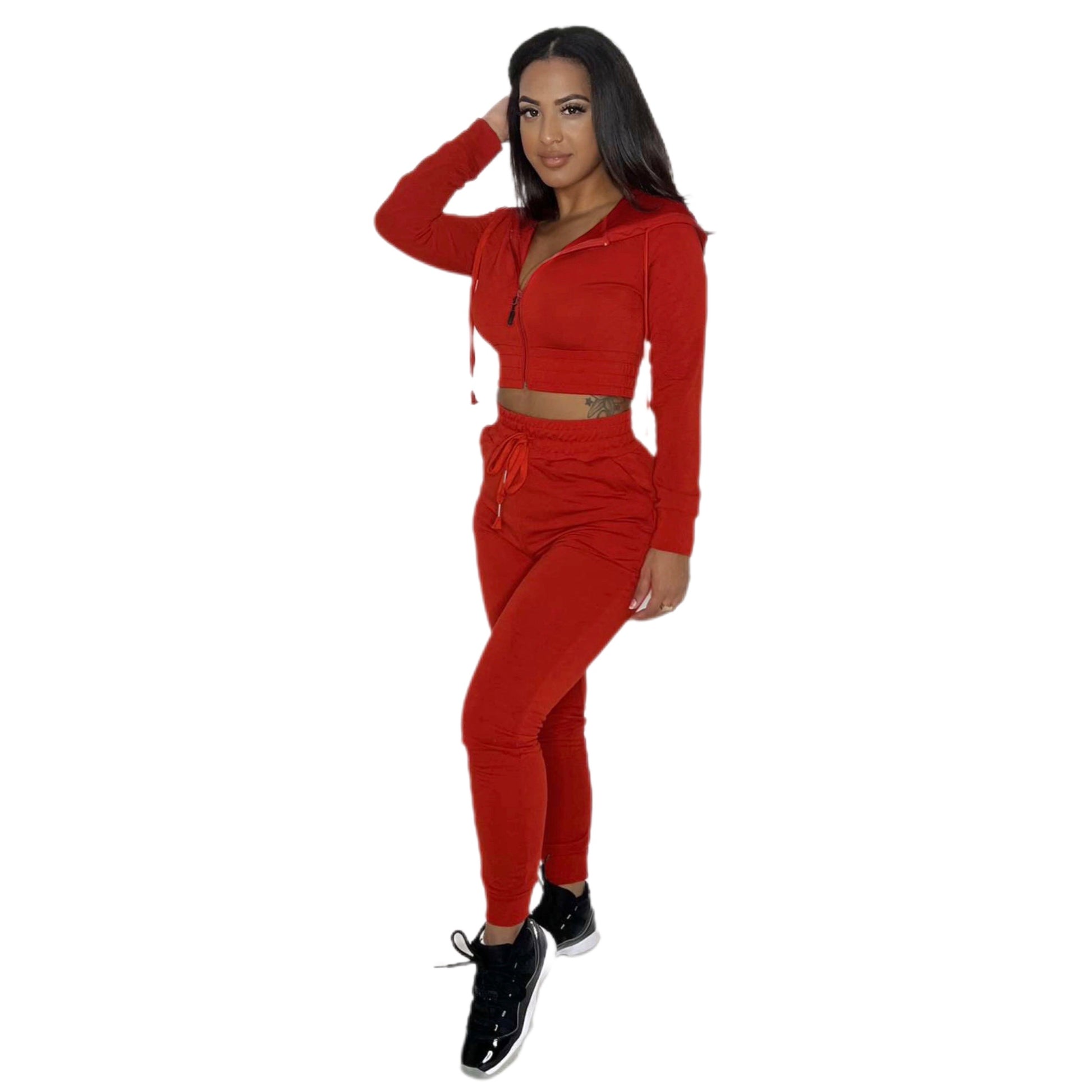 Long Sleeve Hood Zip Up, adjustable drawstring jogger pants. Model is wearing a Size Small. Size up for a loose fit.