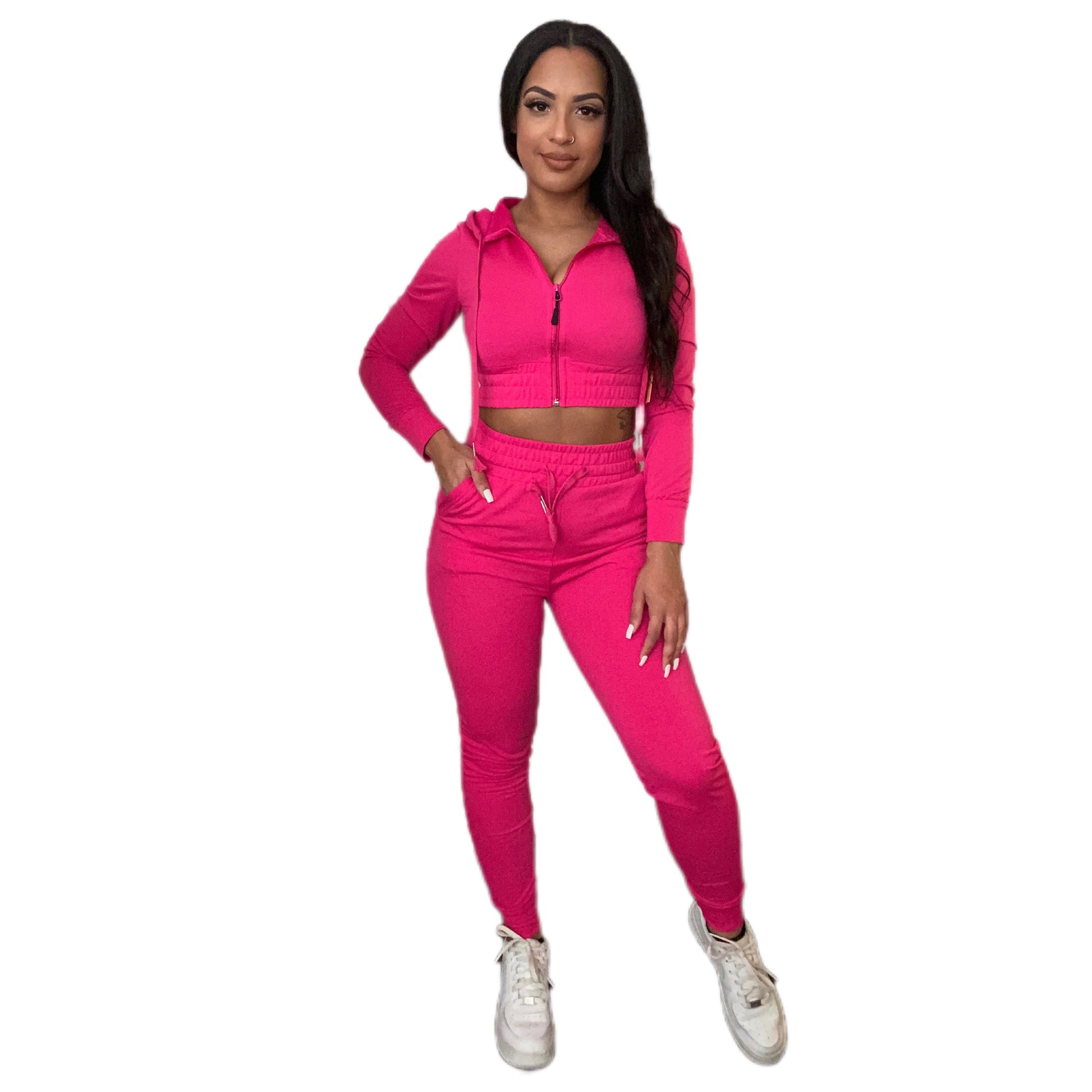 Long Sleeve Hood Zip Up, adjustable drawstring jogger pants. Model is wearing a Size Small. Size up for a loose fit.