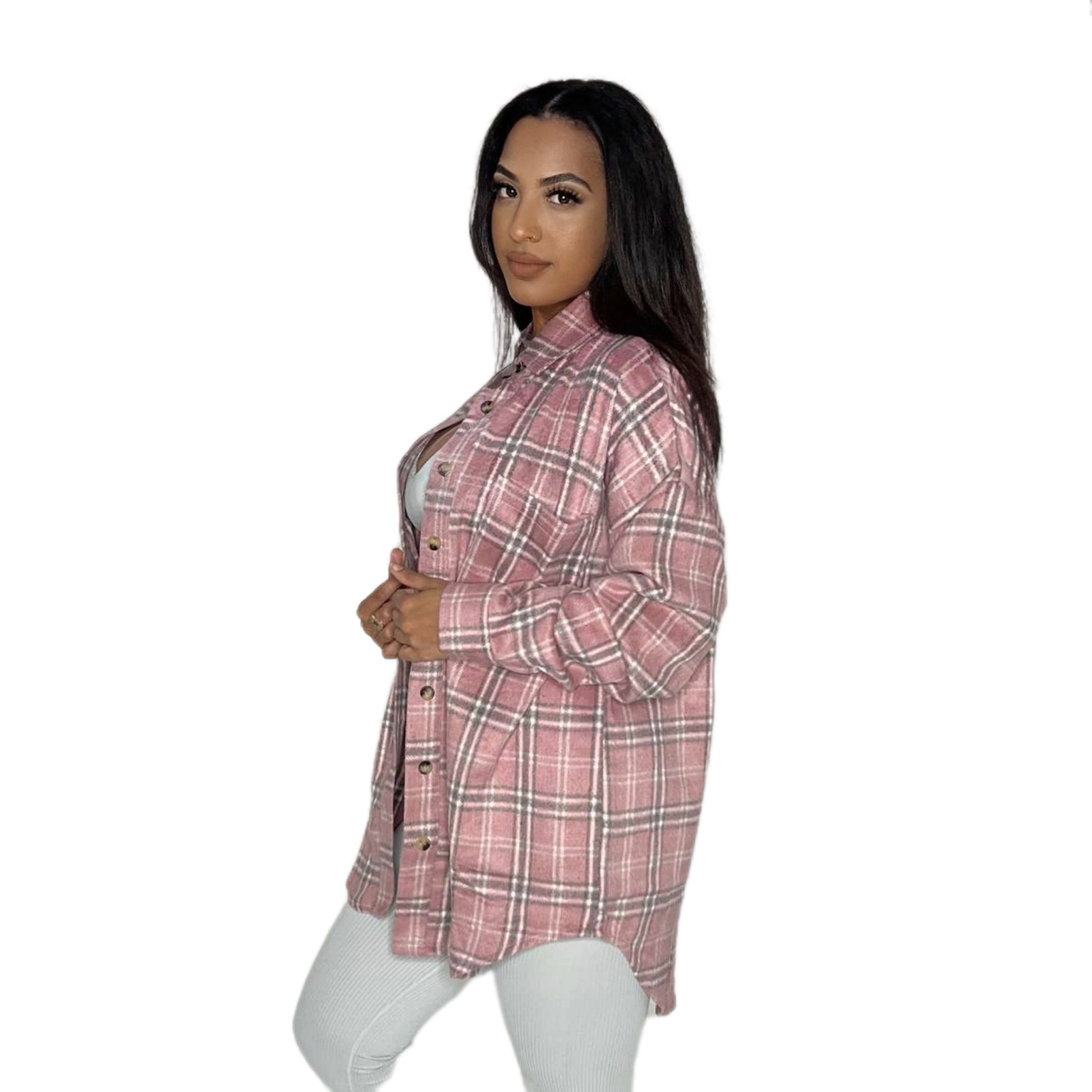 Plaid Check Oversized shacket. Collared Neckline and button placket. 2 pockets. Long sleeves with button cuffs. Model is wearing a size small.